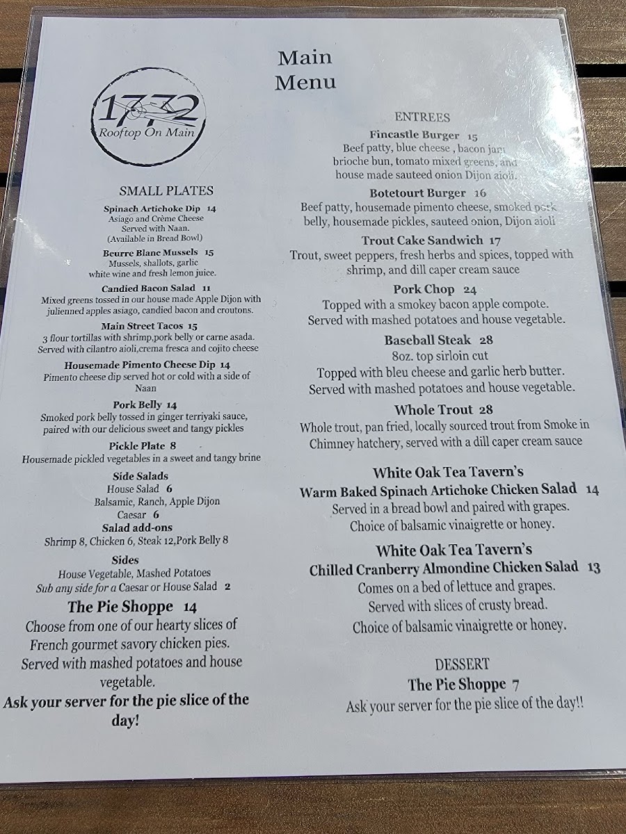 Welcome to 1772 Rooftop on Main, where culinary artistry meets breathtaking Blue Ridge Mountain views. Located in the charming Fincastle, VA, this rooftop dining experience offers a carefully curated menu that celebrates local flavors and fresh ingredients.